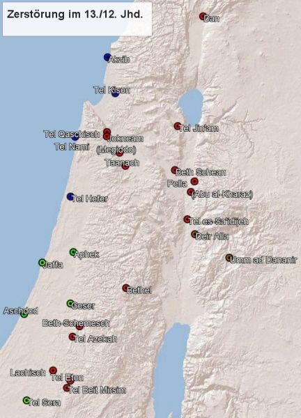 Drittens zeigt uns die Archäologie, dass viele der kanaanäischen Städte um das 13./12. Jahrhundert im Laufe von etwa 100 Jahren zerstört und erst später und nur zum Teil wiederrichtet wurden; manchmal nach einer Besiedlungslücke von über einem Jahrhundert (s. rechts; grob nach Millek 2018. Zu Pella und Abu al Kharaz vgl. Halbertsma 2019, S. 55f.). Es fällt auf, dass fast alle um diese Zeit zerstörten Städte danach phönizisch (blau) oder philistäisch (grün) sind oder an philistäisches Gebiet angrenzen (Beth-Schemesch, Azekah, Lachisch, Eton, Beit Mirsim). Zu Qaschisch, Jokneam, Megiddo, Beth Schean, Pella und Abu al-Kharaz s.u.: Offenbar siedelten auch hier außerhalb des philistäischen Kerngebiets Angehörige der Seevölker (Taanach blieb zunächst unbesiedelt). Aussagekräftig ist auch, welche Städte nicht zerstört wurden: In der direkten Nachbarschaft von Beth Schean etwa blieben Rekesch und Rehob, in denen sich später auch keine Seevölker nachweisen lassen, bestehen. Auch die umgebenden Dörfer scheinen jeweils nicht zerstört und weiterhin bewohnt worden zu sein (s z.B. Gaß 2006, S. 110; Finkelstein 2014, S. 31-34), was ebenfalls für gezielte Eroberungen spricht. Es ist zwar richtig, das sich bei einer noch größeren Zahl der später philistäischen oder phönizischen Städte keine Zerstörung feststellen lässt (Millek 2021), aber die Regelmäßigkeit ist dennoch zu deutlich, um dies gut anders denn als Eroberungen durch die Seevölker deuten zu können – nur Dan, Jin'am, Bethel und auf der anderen Jordanseite Umm ad Dananir fallen aus diesem Muster und müssen anders erklärt werden. Bethel und Umm ad Dananir sind auch die einzigen um diese Zeit zerstörten Städte, die im Gebirge liegen. Dass man bei vielen der späteren Seevölker-Städte keine Zerstörung feststellen kann, sollte man daher besser damit erklären, dass Eroberungen im Alten Orient häufig in Form von Blockaden geschahen, die die hungernden und dürstenden Bewohner dazu bringen sollten, sich zu ergeben (vgl. Eph´al 2009, S. 35-43). Von solchen Blockaden durch die Philister berichtet die Bibel z.B. in 1 Sam 23,1-5; 28,4; 2 Sam 5,17f. Den Sinn solcher Belagerungen durch siedlerkoloniale Mächte wie die Philister zeigt uns Dtn 20,10f..